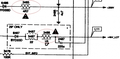 飞利浦29PT4423/93R开机2,3秒就保护,停机.刚开机时:就烧焦3488电阻(大概1/2w4.7,如看错请告之一下),现已替换3488电阻;帧输出块STV9379FA;TDA8375A; 偏转等一些关键元件,都无济于事.只有请飞利浦维修高手指点!先谢谢了!