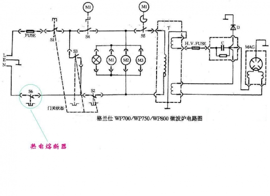 下面以格兰仕WP700---900微波炉为例,结合电路图中的电路符号和实物,讲解各元器件物理性能和在电路中的作用,以及好坏的检测方法。根据我们的经验,认为只有对电路和元器件认识充分,才能在修理中得心应手。