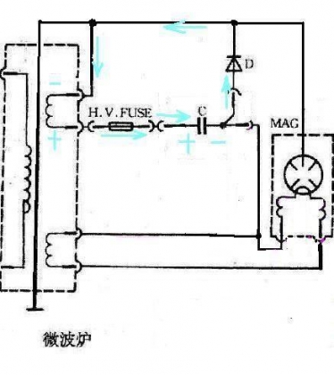 要说明的是:电子流方向正好相反,负高压的电子,从与二极管正极相联的电容器那端,流到灯丝,在磁控管里流到屏极,流到地(微波炉机壳),再由高压线圈,回到电容器的另一端(正高压)。