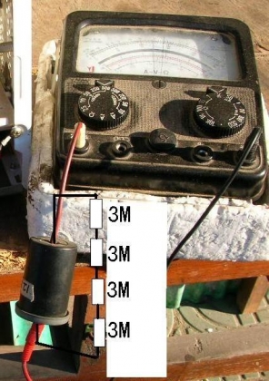 为了安全,我们将4个3M欧电阻串联后装入一个彩色胶卷壳里。引出用香焦插头插座。严防露线触电伤人!