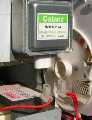 磁控微波管,是一种电子管-——也叫真空管,是热电子发射。注意是“热电子” “发射”!我们拔下一个灯丝插座,叫它不热。再拔下另一个灯丝插座,叫它没地方发射!